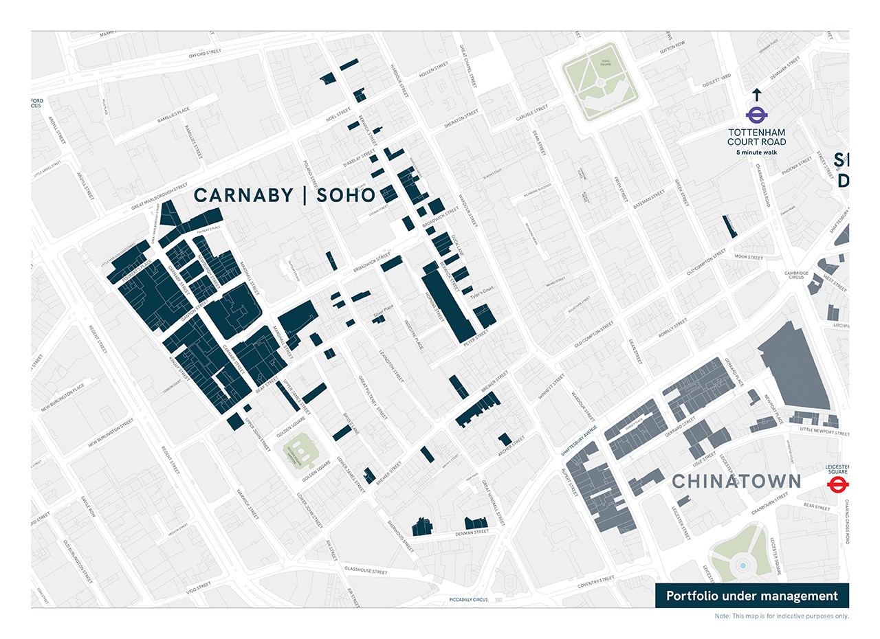 Our portfolio in central Soho, focused on Berwick, Beak and Broadwick Street offers a diverse array of creative and independent businesses, iconic restaurants and entertainment venues. As a renowned hub for the creative sector, employees of these businesses add to the unique character of the area.